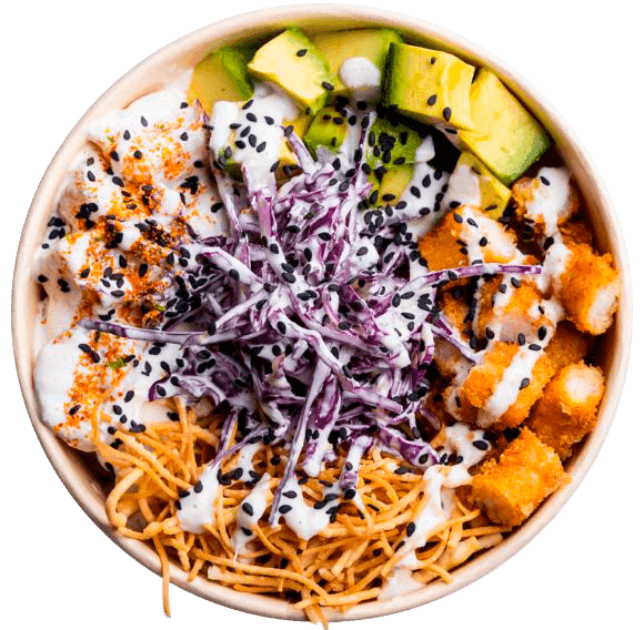 Trucha, mango, palta, kiuri, acompañada de salsa Tropical y wantán